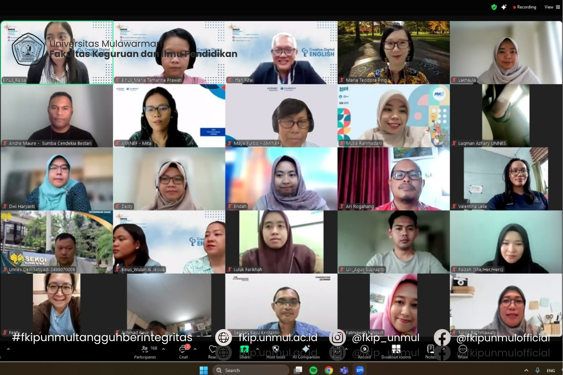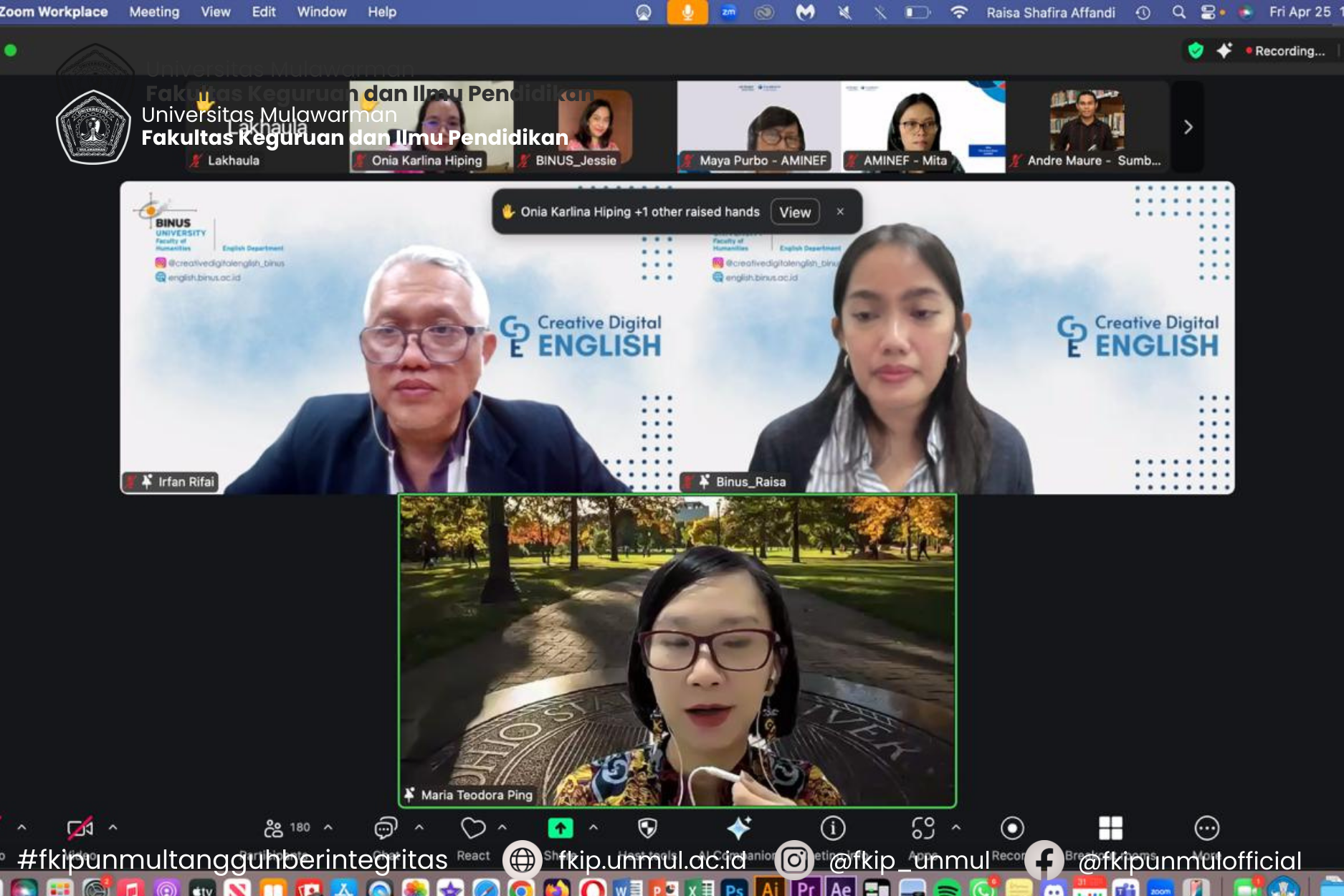 Samarinda, 25 April 2025 - Salah satu dosen Program Studi Pendidikan Bahasa Inggris jenjang S1 dan S2 Fakultas Keguruan dan Ilmu Pendidikan (FKIP) Universitas Mulawarman, Dr. Maria Teodora Ping, menjadi salah satu pembicara dalam kegiatan Fulbright Research Presentation yang dilaksanakan secara daring melalui Zoom Meeting pada Jumat, 25 April 2025.