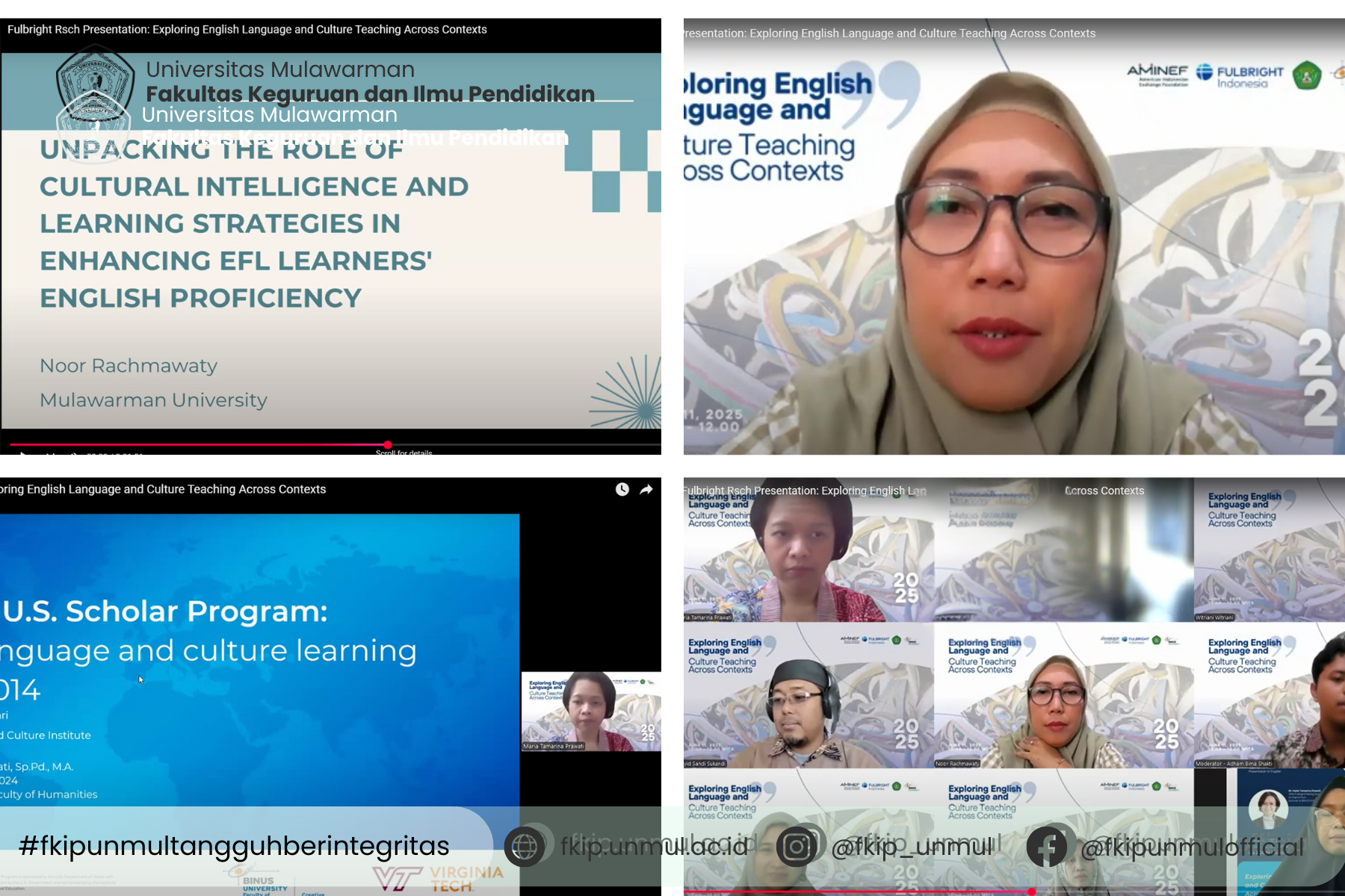 Samarinda, 11 Juni 2025 - Salah satu dosen Fakultas Keguruan dan Ilmu Pendidikan (FKIP) Universitas Mulawarman, Dr. Noor Rachmawaty, menjadi pembicara dalam kegiatan Fulbright Research Presentation bertajuk “Exploring English Language and Culture Teaching Across Contexts” yang diselenggarakan secara daring melalui Zoom. Kegiatan ini merupakan hasil kolaborasi antara AMINEF, BINUS University, dan Universitas Mulawarman, serta terbuka untuk publik.