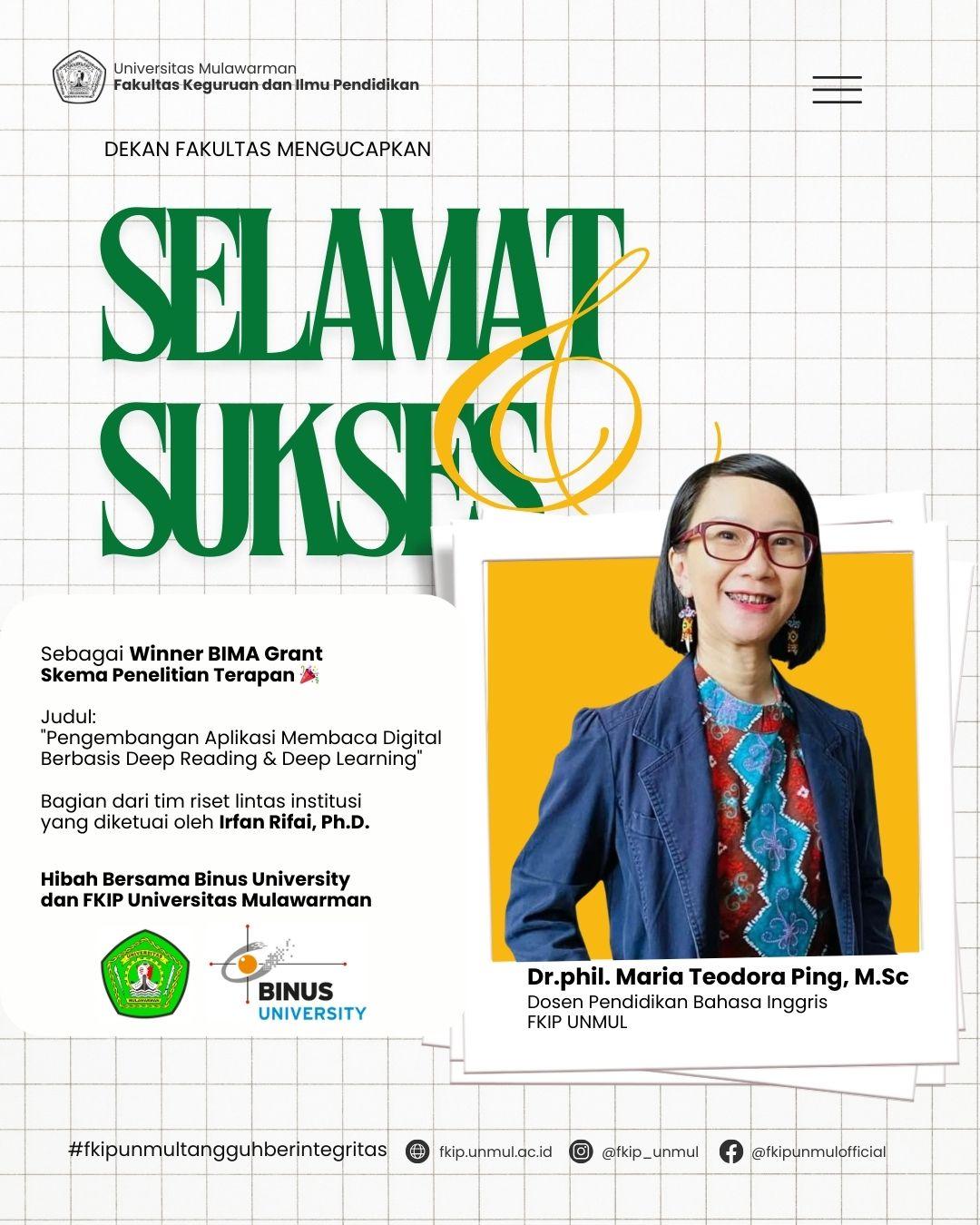 Senin, 26 Mei 2025 - Salah satu dosen Fakultas Keguruan dan Ilmu Pendidikan (FKIP) Universitas Mulawarman, Dr.phil. Maria Teodora Ping, M.Sc, kembali menorehkan prestasi membanggakan di tingkat nasional. Dosen dari Program Studi Pendidikan Bahasa Inggris tersebut terpilih sebagai salah satu penerima BIMA Grant Skema Penelitian Terapan Tahun 2025, yang diselenggarakan oleh Direktorat Riset, Teknologi, dan Pengabdian kepada Masyarakat, Direktorat Jenderal Pendidikan Tinggi, Riset, dan Teknologi.