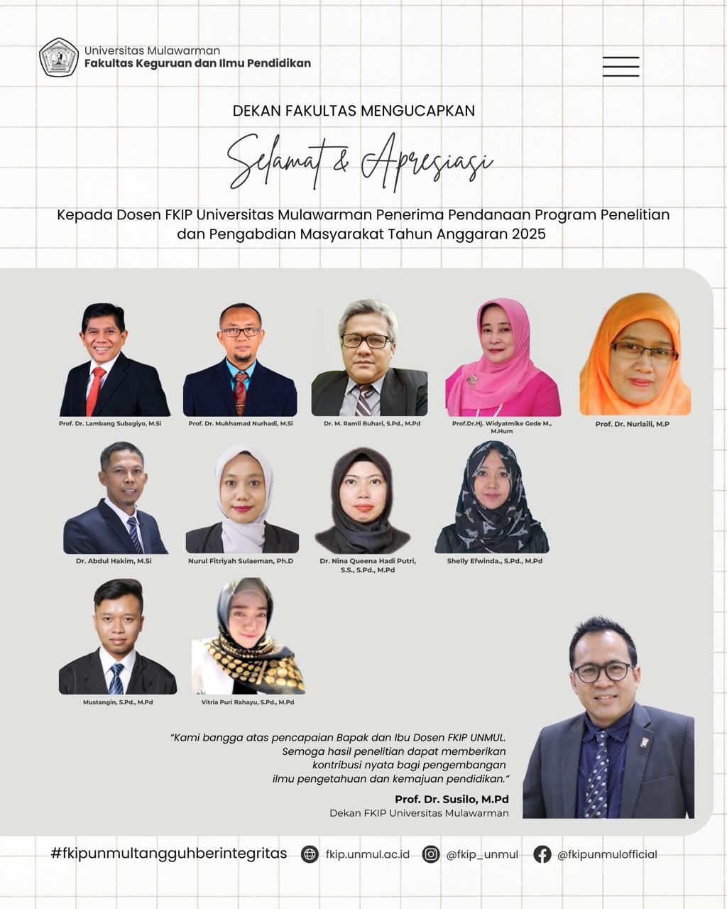 Senin, 26 Mei 2025, Fakultas Keguruan dan Ilmu Pendidikan (FKIP) Universitas Mulawarman kembali menorehkan prestasi membanggakan. Berdasarkan surat dari Direktorat Jenderal Riset dan Pengembangan Kementerian Pendidikan, Kebudayaan, Riset, dan Teknologi (KEMDIKTI-SAINTEK) tertanggal 23 Mei 2025, sejumlah dosen FKIP dinyatakan lolos sebagai penerima pendanaan Program Penelitian dan Pengabdian kepada Masyarakat Tahun Anggaran 2025.