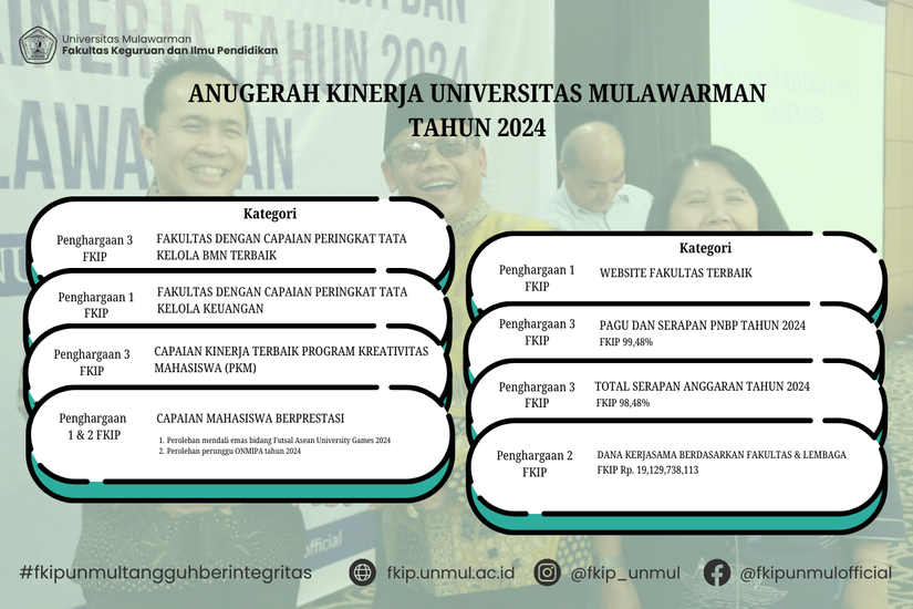 FKIP Universitas Mulawarman berhasil meraih berbagai penghargaan pada malam penganugerahan tersebut, termasuk menempati posisi teratas di beberapa kategori kinerja. Berikut adalah penghargaan yang diterima oleh FKIP: