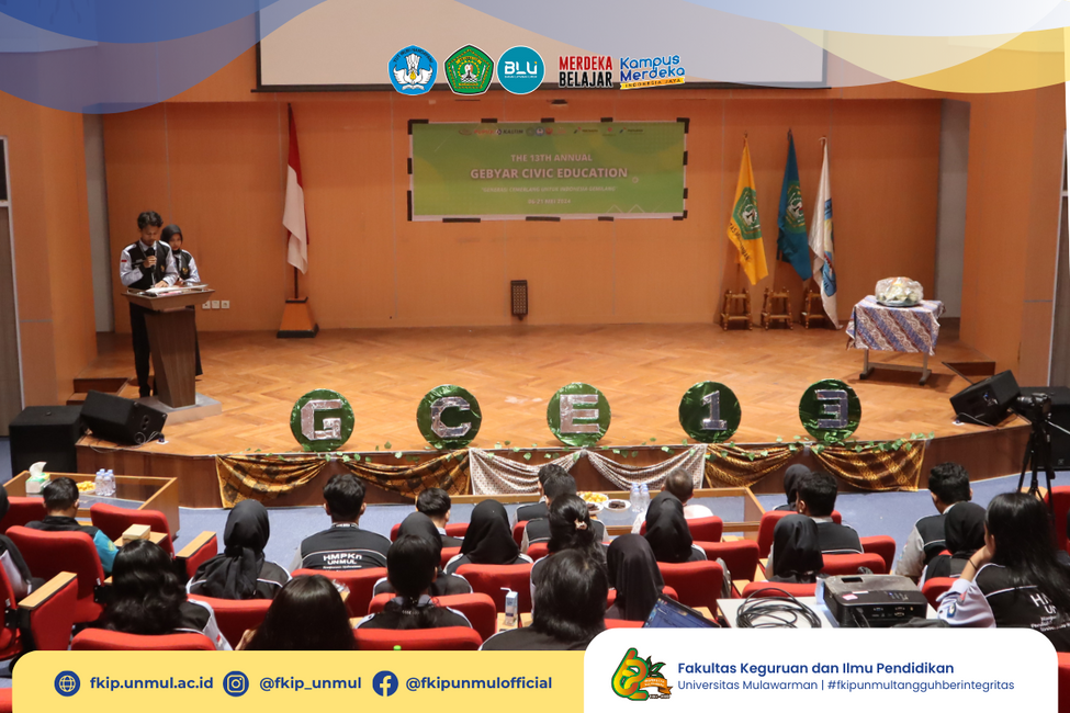 Samarinda (06/05), Universitas Mulawarman pada tanggal 6 Mei 2024, Gedung Prof. Dr. H. Masjaya, M.Si Ruang Theater, mengadakan Grand Opening Gebyar Civic Education (GCE) ke-13 yang diprakarsai oleh Himpunan Mahasiswa Pendidikan Kewarganegaraan Univesitas Mulawarman.