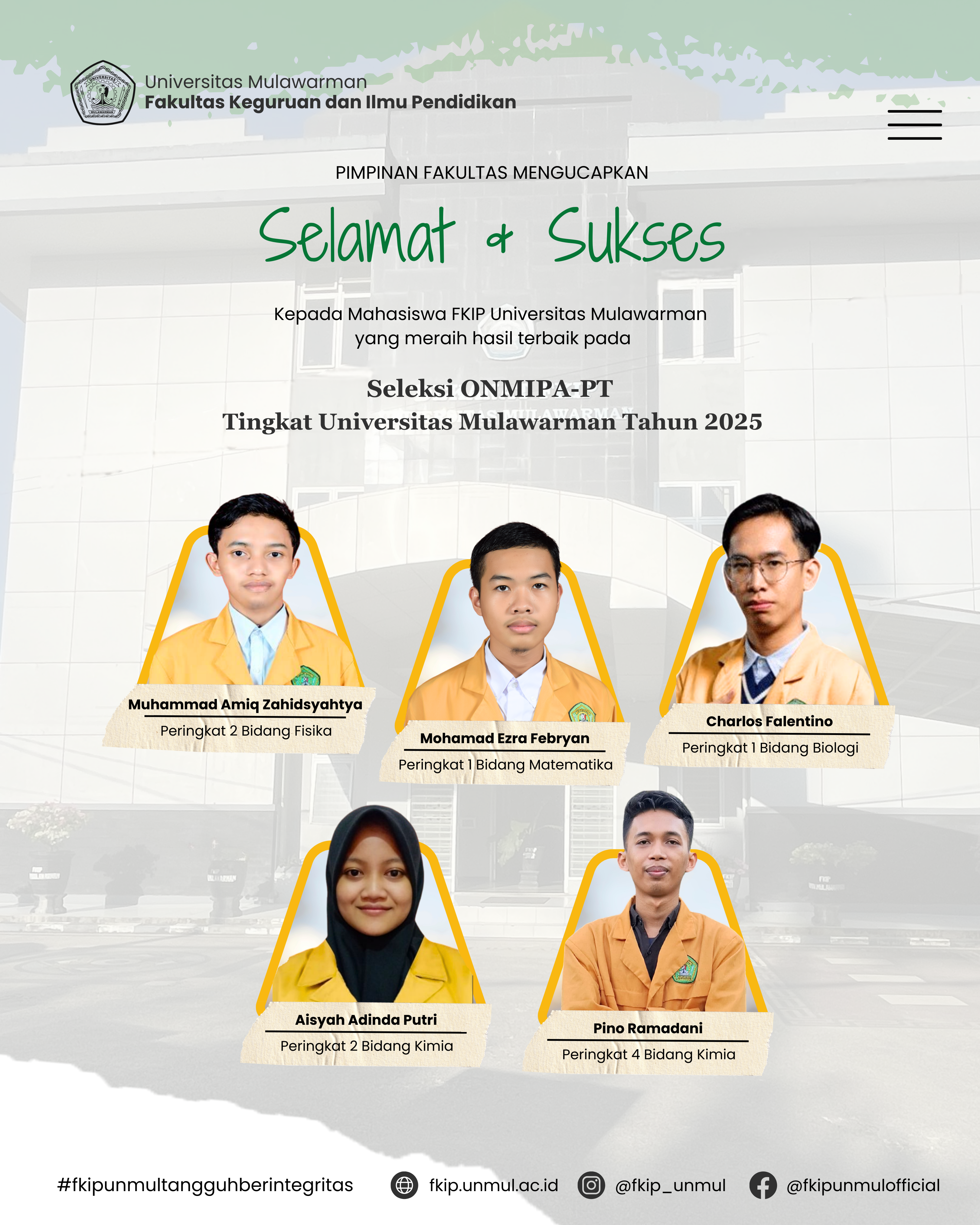 Samarinda, 05 Juli 2025 - FKIP Universitas Mulawarman mengucapkan selamat kepada mahasiswa yang berhasil meraih hasil terbaik pada Seleksi Olimpiade Nasional Matematika dan Ilmu Pengetahuan Alam Perguruan Tinggi (ONMIPA-PT) Tingkat Universitas Mulawarman Tahun 2025.