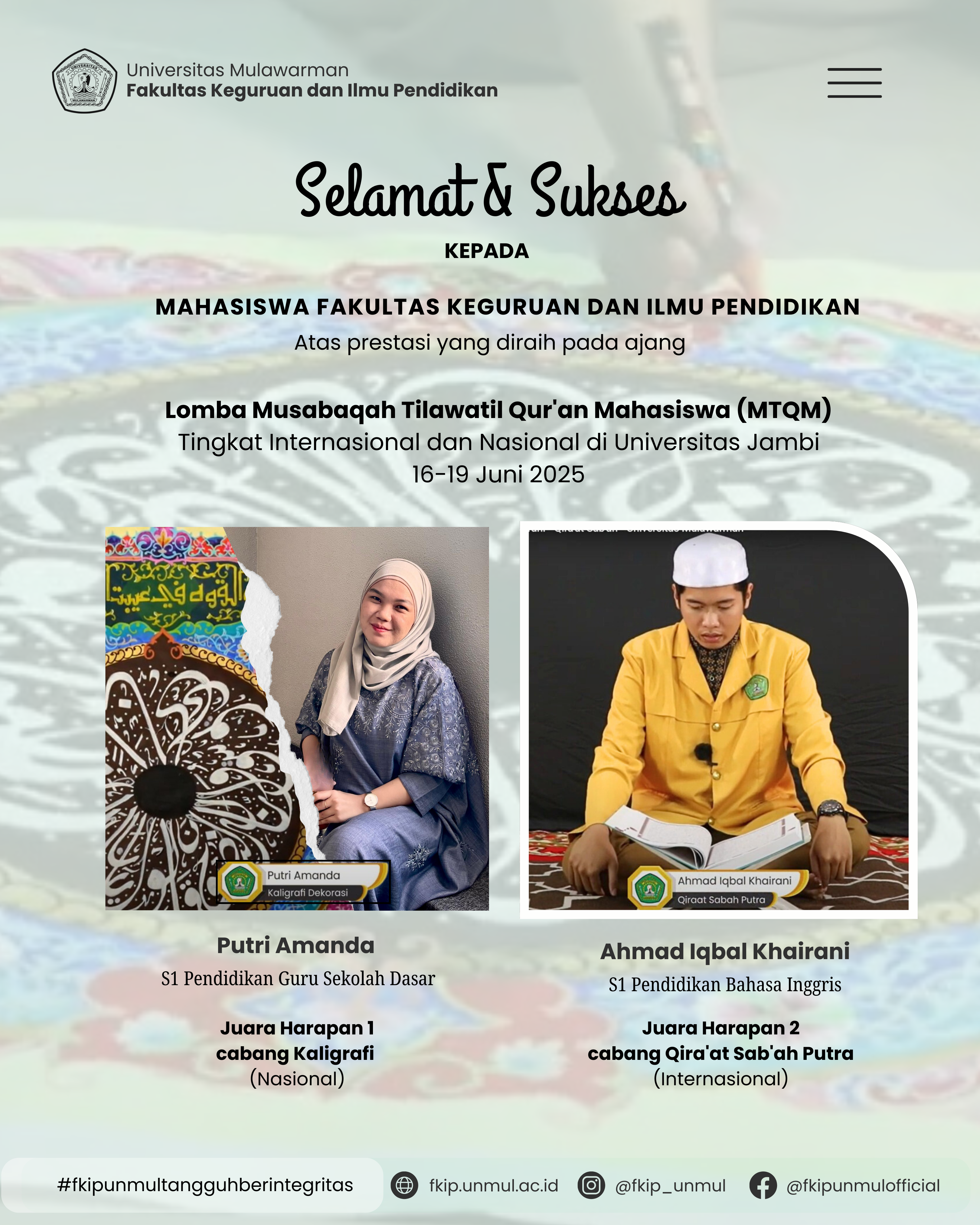 Jumat - 20 Juni 2025, Fakultas Keguruan dan Ilmu Pendidikan (FKIP) Universitas Mulawarman menyampaikan ucapan selamat dan apresiasi kepada dua mahasiswa yang telah menorehkan prestasi membanggakan dalam ajang Musabaqah Tilawatil Qur'an Mahasiswa (MTQM) Tingkat Internasional dan Nasional yang diselenggarakan di Universitas Jambi pada 16–19 Juni 2025.