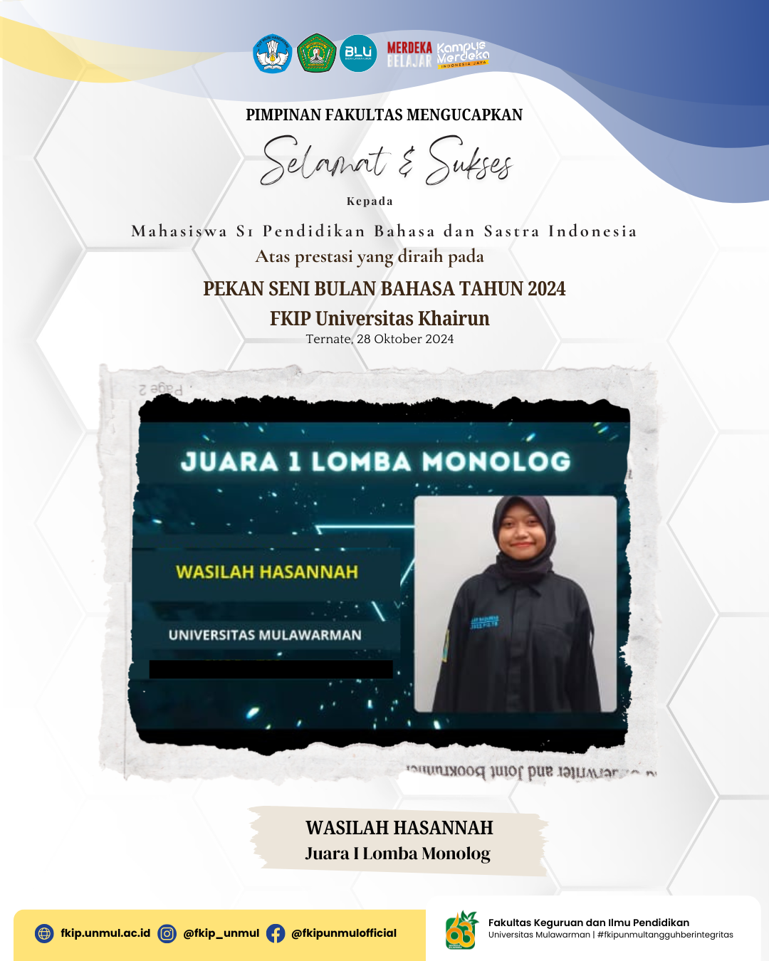 Samarinda, 29 Oktober 2024 — Prestasi membanggakan kembali ditorehkan oleh mahasiswa Fakultas Keguruan dan Ilmu Pendidikan (FKIP) Universitas Mulawarman dalam ajang Pekan Seni Bulan Bahasa 2024 yang diselenggarakan pada tanggal 28 Oktober 2024 oleh FKIP Universitas Khairun. Wasilah Hasannah, mahasiswa Program Studi Pendidikan Bahasa dan Sastra Indonesia FKIP Universitas Mulawarman, berhasil meraih Juara 1 dalam kategori Lomba Monolog.