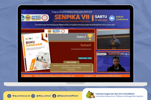Samarinda, 08 Juni 2024 - Fakultas Keguruan dan Ilmu Pendidikan Universitas Mulawarman (FKIP UNMUL) kembali meraih prestasi luar biasa di bidang pendidikan matematika. Kelompok 1 dari Program Studi Pendidikan Matematika yang terdiri dari Ismail, Nur Syifa Azizah, dan Diva Fitria Ali berhasil mendapatkan Juara 2 Tingkat Nasional dalam Lomba Media dan Alat Peraga Pembelajaran Matematika SENPIKA BERKARYA 2024.