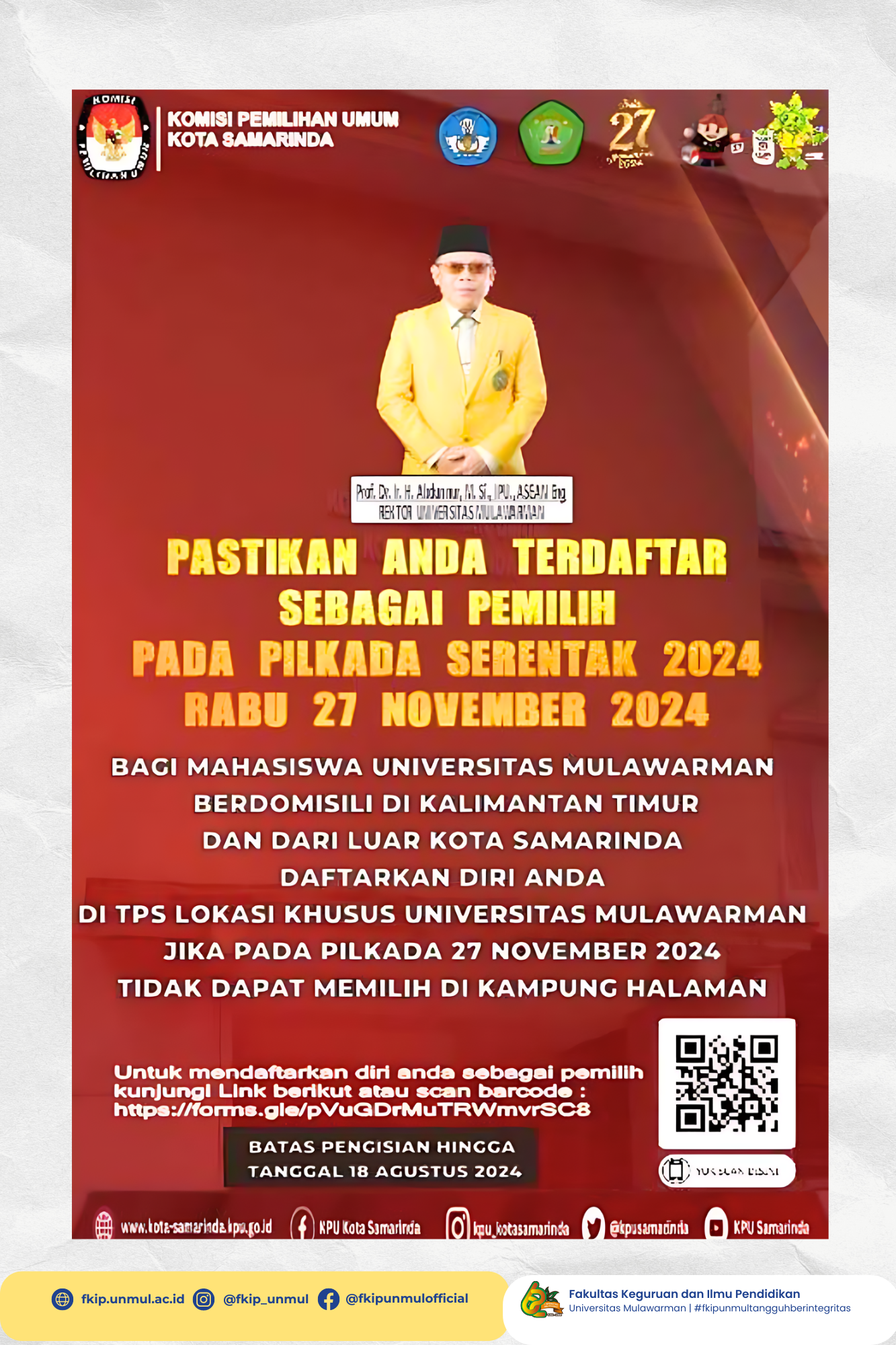 Samarinda (31/07), Dalam rangka menyukseskan pelaksanaan Pemilihan Gubernur dan Wakil Gubernur, Bupati dan Wakil Bupati, serta Wali Kota dan Wakil Wali Kota di Provinsi Kalimantan Timur, khususnya Kota Samarinda, Rektor Universitas Mulawarman mengajak seluruh civitas akademika Fakultas Keguruan dan Ilmu Pendidikan (FKIP) untuk berpartisipasi aktif dalam pengisian formulir pendaftaran pemilih di Tempat Pemungutan Suara (TPS) lokasi khusus.