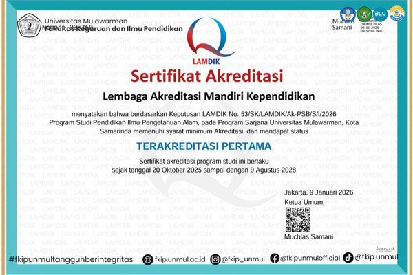 Samarinda, 10 Januari 2026 – Program Studi Pendidikan Ilmu Pengetahuan Alam (IPA) Program Sarjana Fakultas Keguruan dan Ilmu Pendidikan (FKIP) Universitas Mulawarman resmi memperoleh Status Terakreditasi Pertama dari Lembaga Akreditasi Mandiri Kependidikan (LAMDIK).