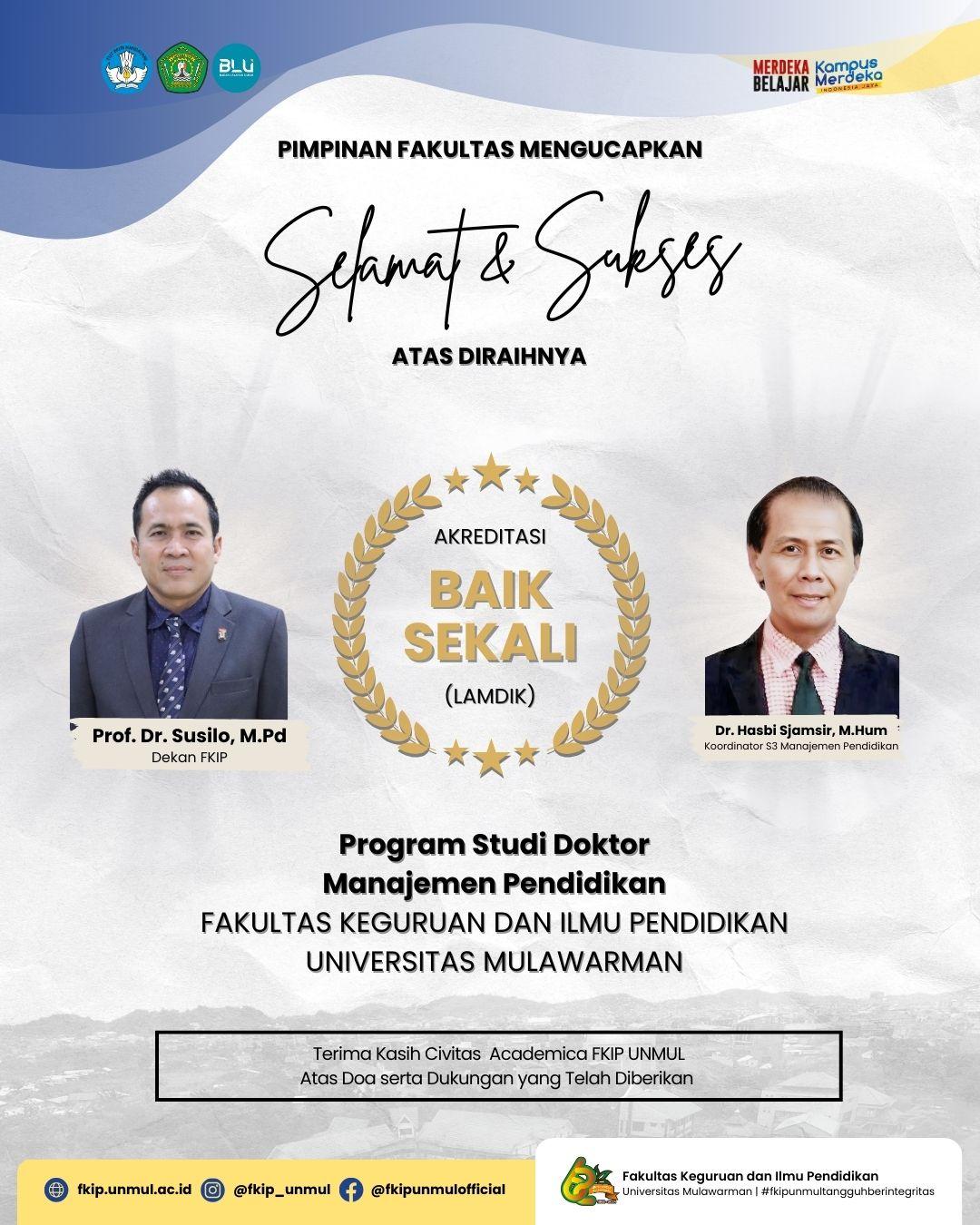 Samarinda, 7 Oktober 2024 – Program Doktor Manajemen Pendidikan Fakultas Keguruan dan Ilmu Pendidikan (FKIP) Universitas Mulawarman dengan bangga mengumumkan pencapaian akreditasi "Baik Sekali" yang diberikan oleh Lembaga Akreditasi Mandiri Kependidikan (LAMDIK). Akreditasi ini diberikan melalui Surat Keputusan Nomor 1537/SK/LAMDIK/Ak/D/X/2024, yang berlaku mulai 17 Juli 2024 hingga 16 Juli 2029.