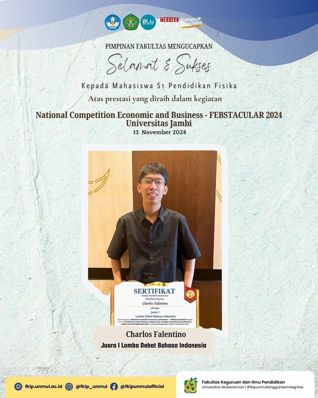 15 November 2024 - Fakultas Keguruan dan Ilmu Pendidikan Universitas Mulawarman dengan bangga mengucapkan selamat kepada Charlos Falentino (NIM 2205036002), mahasiswa Program Studi S1 Pendidikan Fisika, atas prestasi gemilang yang diraih sebagai Juara 1 Lomba Debat Bahasa Indonesia dalam kegiatan National Competition Economic and Business - FEBSTACULAR 2024.