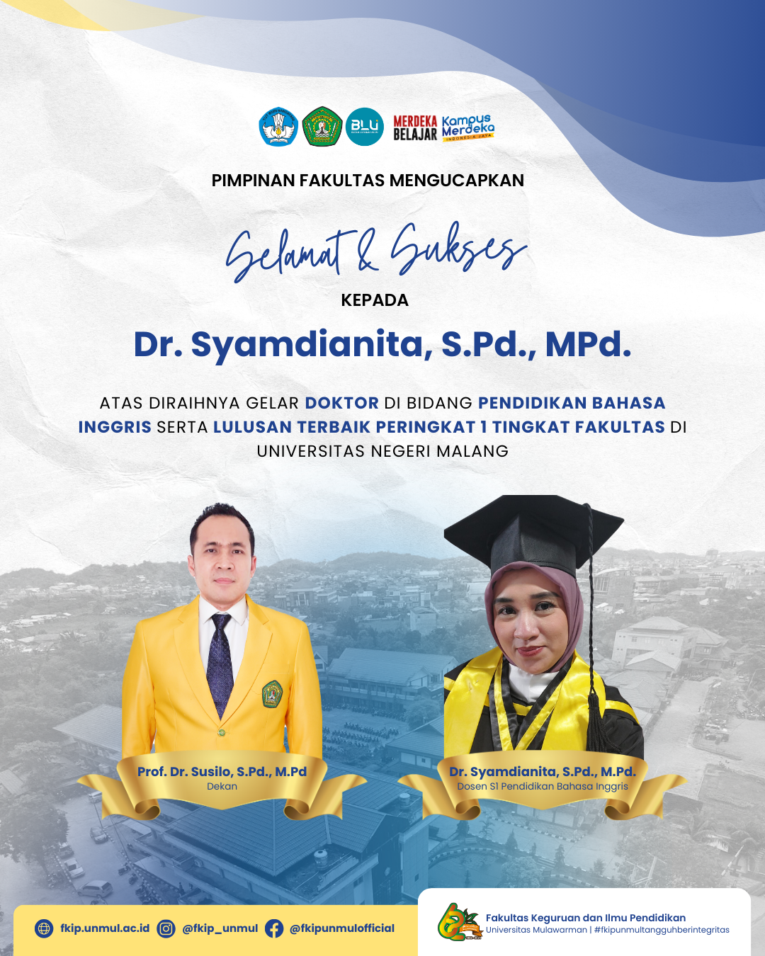 Selamat dan Sukses kepada Dr. Syamdianita, S.Pd., M.Pd atas diraihnya Gelar Doktor di Bidang Pendidikan Bahasa Inggris dan Lulusan Terbaik Peringkat 1 Tingkat Fakultas di Universitas Negeri Malang