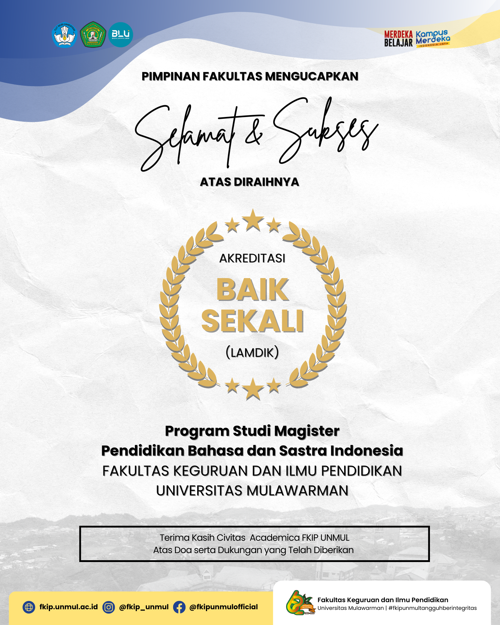 Kami dengan bangga mengucapkan selamat atas pencapaian luar biasa yang telah diraih oleh Program Magister Pendidikan Bahasa dan Sastra Indonesia FKIP Universitas Mulawarman. Program studi ini telah berhasil mendapatkan akreditasi "Baik Sekali" dari LAMDIK.
