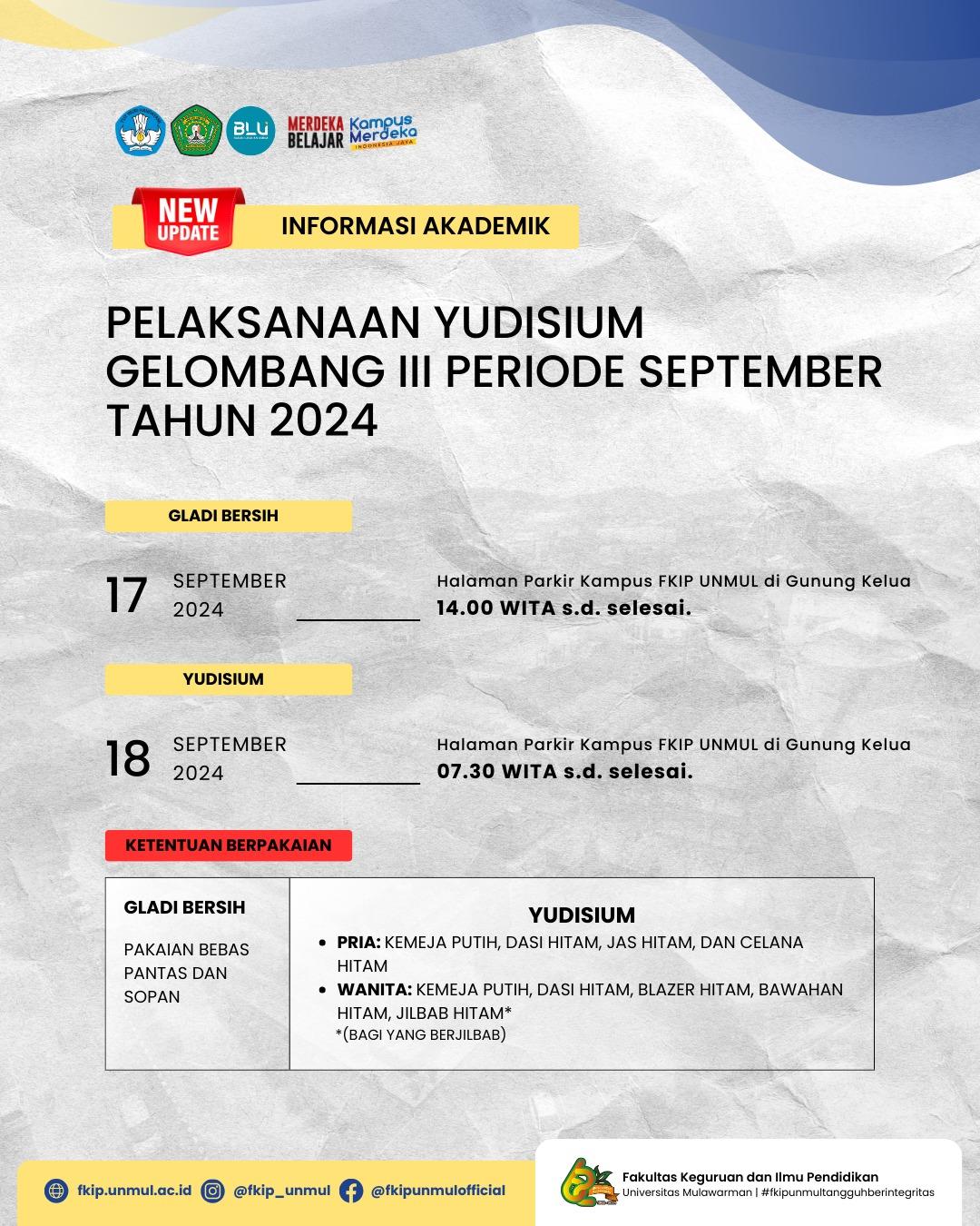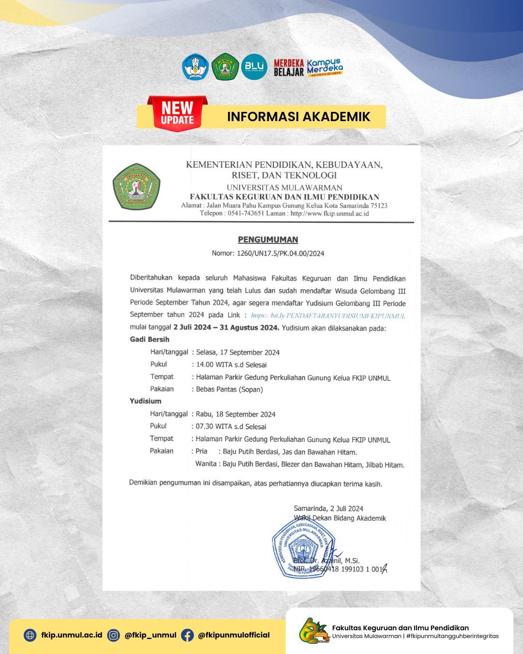 Samarinda, (02/07), Fakultas Keguruan dan Ilmu Pendidikan (FKIP) Universitas Mulawarman dengan bangga mengumumkan pendaftaran Yudisium Gelombang III Periode September Tahun 2024. Acara ini merupakan momentum penting bagi para mahasiswa yang telah menyelesaikan studi mereka dan siap untuk diwisuda.
