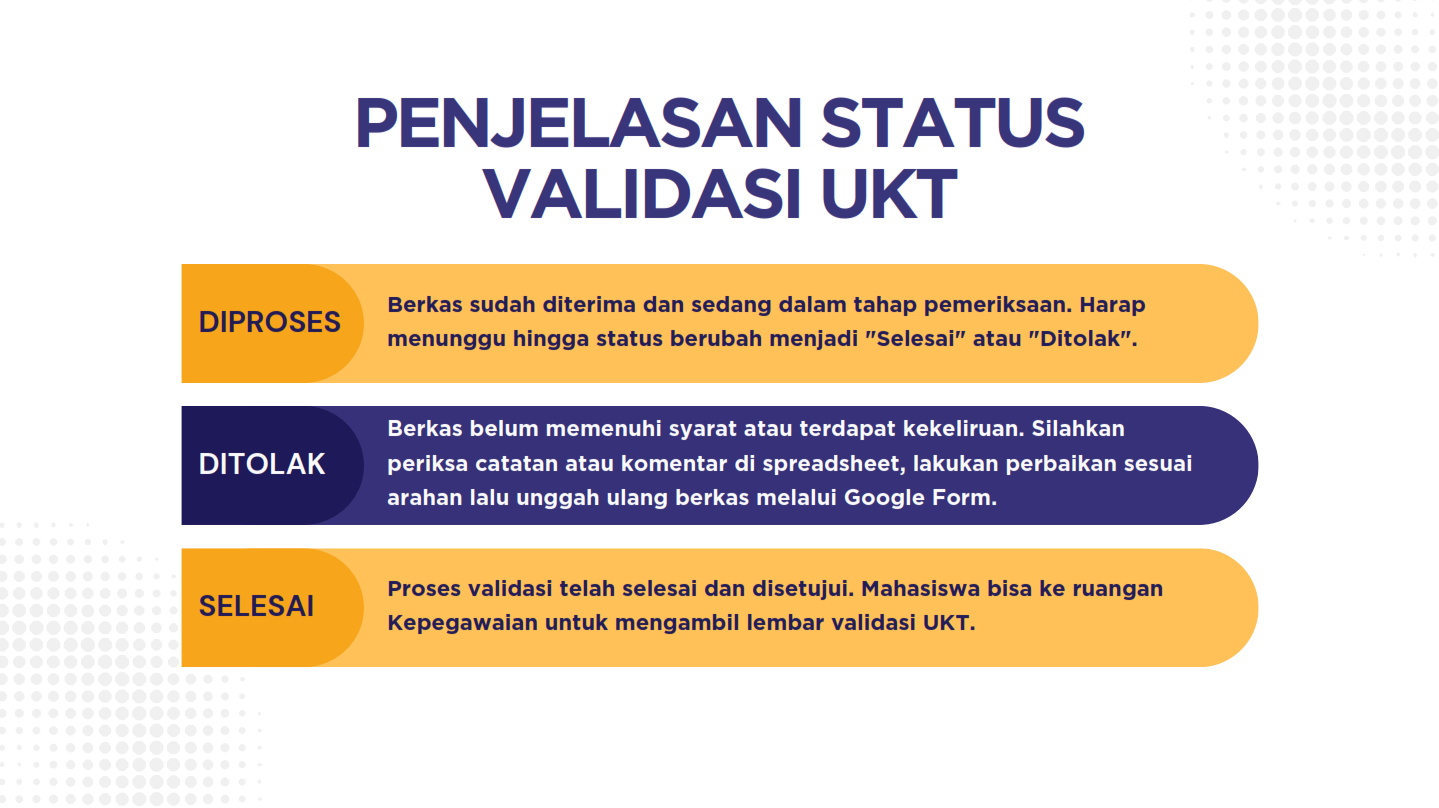 https://shorturl.at/IG64mApabila status validasi UKT “Ditolak”, mahasiswa wajib melakukan perbaikan berkas sesuai catatan yang tercantum pada spreadsheet.