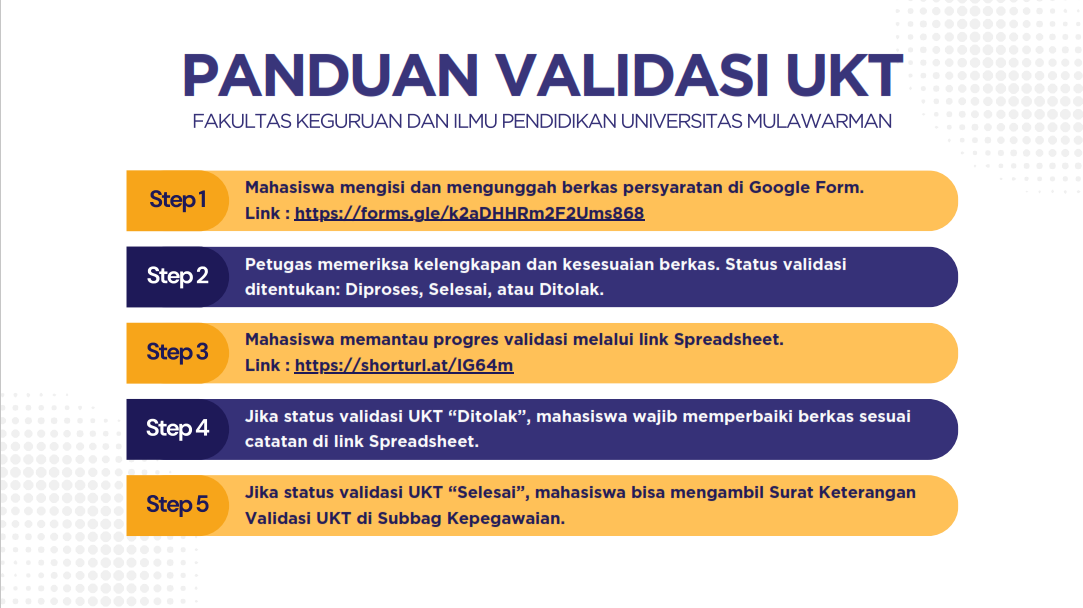 Layanan ini diperuntukkan bagi mahasiswa FKIP Universitas Mulawarman yang mengajukan validasi UKT sebagai bagian dari persyaratan akademik.